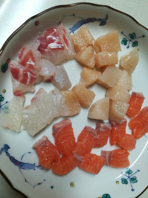 鯛、サーモン、ほたてを1.5cmくらいの角切りに。軽く塩(分量外)をして余分な水分を出す。