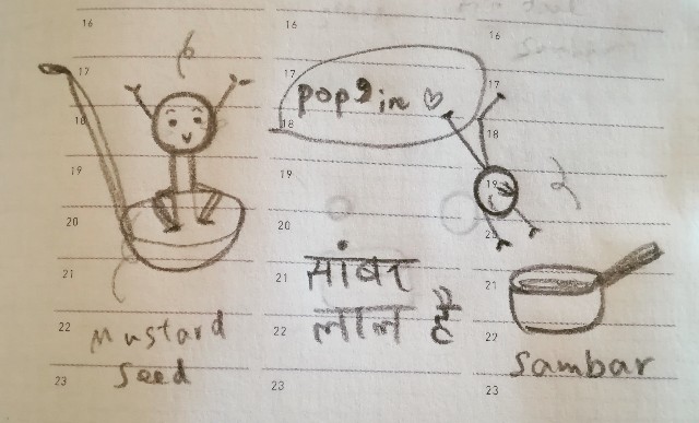 2020-04-20 マスタードシードちゃんの冒険 ヒンディー絵本のタネ Nikki インド ごはん you are what you eat ヒンディー語 教育 旅 言語習得、にほんご #mustardseed jump into #sambar#सांबर सांबर लाल है (#サンバル は赤いよ〜/サンバル ラール ハェ) マスタードシード(のテンパリング)が赤いサンバルに飛び込むの図。 サンバルはトマトベースのさっぱりしたスープカレー的なやつ、@南インド #hindipicturebook #ヒンディー語 #ヒンディー語絵本 作ってみたい?!